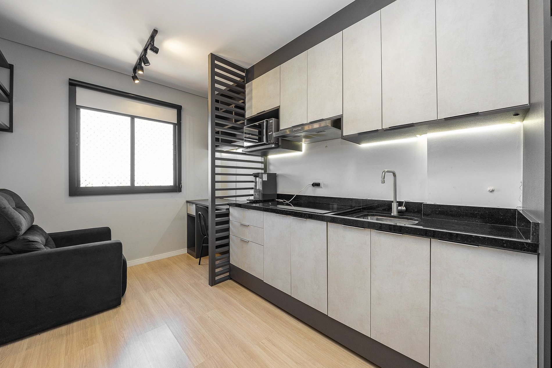 Studio totalmente mobiliado, no 12º andar, em excelente localização no centro de Curitiba/PR. Finamente decorado, com aproximadamente 30m², conta com: Wi-Fi, aquecimento a gás, móveis sob medida, cama casal, smart TV, Cadeiras, geladeira duplex, fogão, microondas, forno elétrico, utensílios para cozinha, cafeteira, air Fryer, pipoqueira elétrica, chaleira elétrica. *Roupas de cama, mesa e banho não estão incluídas.