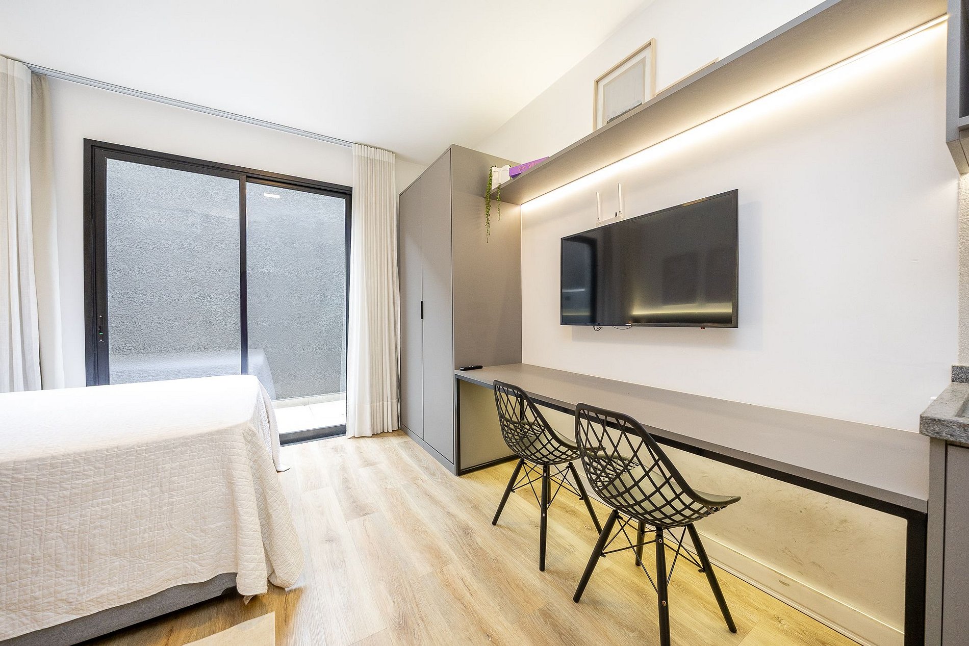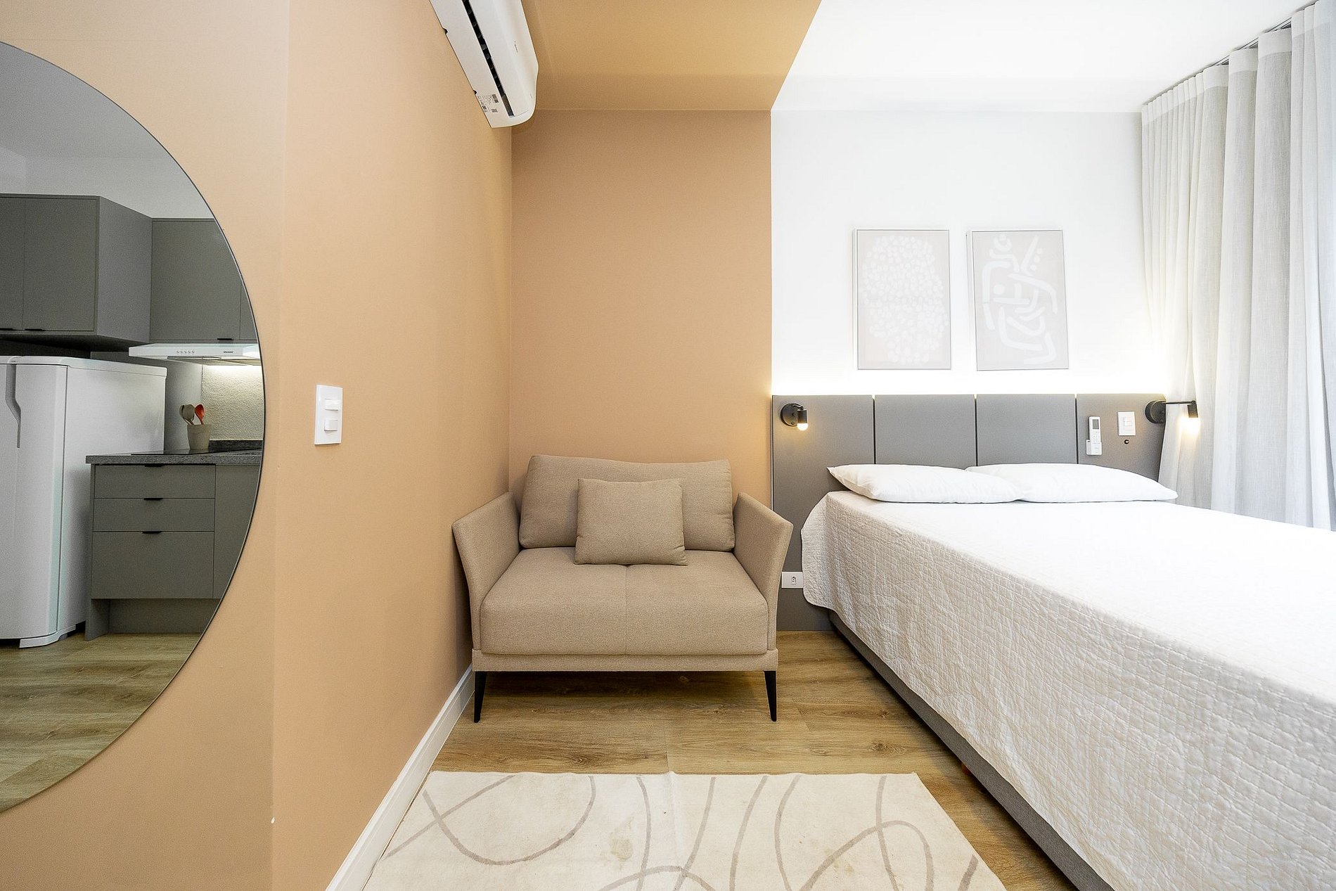 Sobre o apartamento: Studio totalmente mobiliado, no 1º andar, em excelente localização no Rebouças em Curitiba/PR. Finamente decorado, com aproximadamente 27m, conta com: Wi-Fi incluído, Aquecimento central, Móveis sob medida, Cama box casal, Smart TV, Fogão de indução de 2 bocas, micro-ondas, Jogo de panelas, Talheres, Jogo de facas, Louças, Utensílios para cozinha. Região com facilidades e comodidades. *Roupas de cama, mesa e banho não estão incluídas. O que está incluído no pacote mensal*: Aluguel, condomínio, água, gás, internet e energia eléctrica. O pacote mensal é calculado com base no consumo médio dos meses anteriores e consumos muito elevados poderão gerar cobrança adicional.