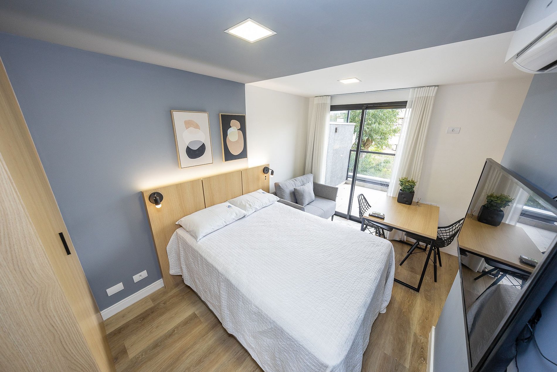 Sobre o apartamento: Studio totalmente mobiliado, no 2º andar, em excelente localização no Rebouças em Curitiba/PR. Finamente decorado, com aproximadamente 17m, conta com: Wi-Fi incluído, Aquecimento central, Móveis sob medida, Cama box casal, Smart TV, Fogão de indução de 2 bocas, micro-ondas, Jogo de panelas, Talheres, Jogo de facas, Louças, Utensílios para cozinha. Região com facilidades e comodidades. *Roupas de cama, mesa e banho não estão incluídas. O que está incluído no pacote mensal*: Aluguel, condomínio, água, gás, internet e energia eléctrica. O pacote mensal é calculado com base no consumo médio dos meses anteriores e consumos muito elevados poderão gerar cobrança adicional.