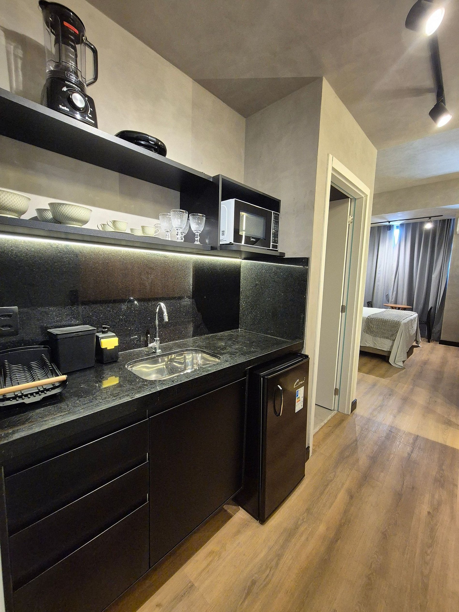 O studio conta com cama queen, sofá-cama e ar-condicionado, acomodando até 3 pessoas com conforto. A cozinha é equipada com micro-ondas, liquidificador, sanduicheira, cafeteira (com café disponível) e utensílios essenciais.