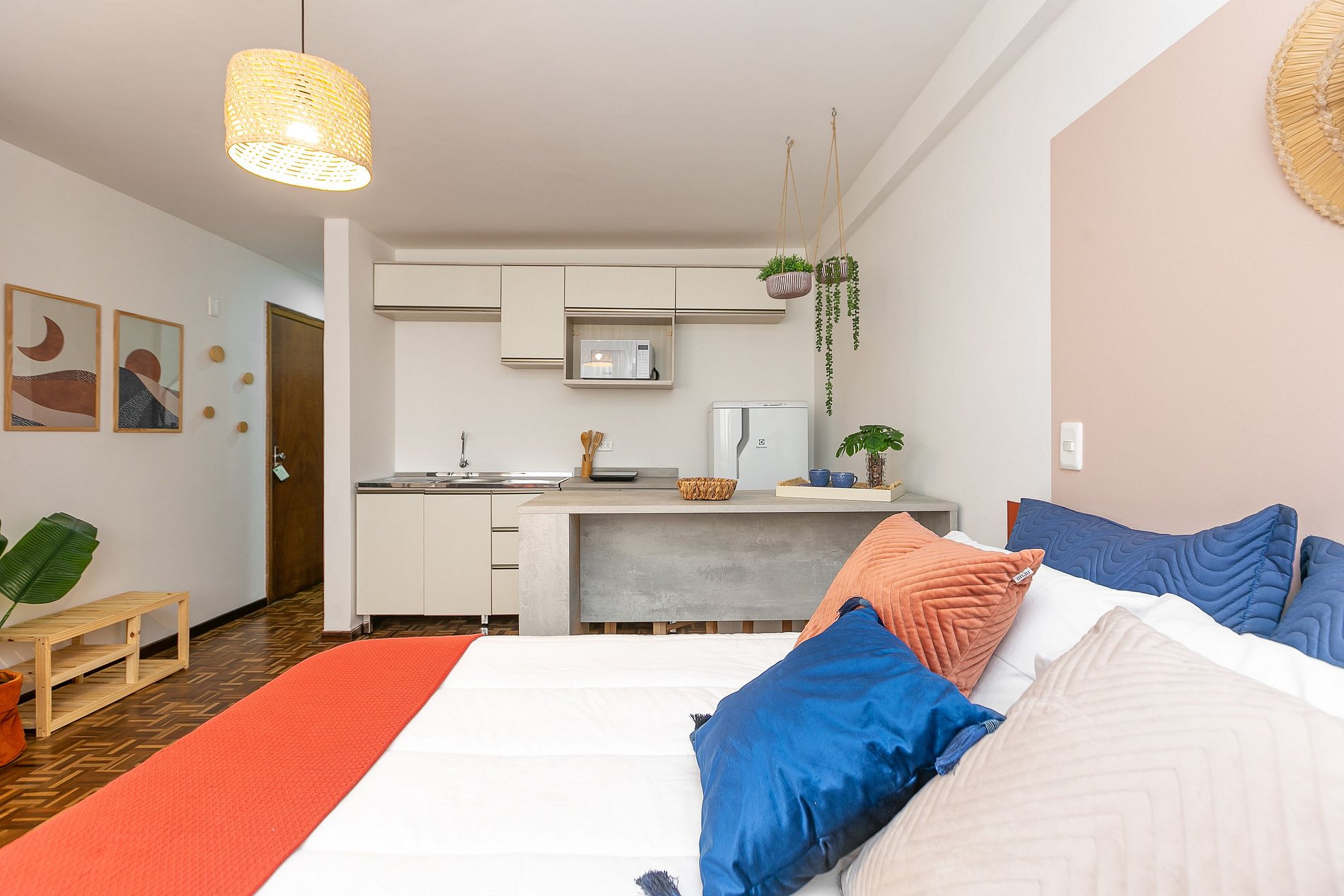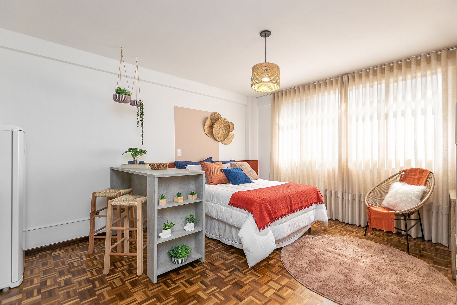Studio, totalmente mobiliado, no 10º andar, em excelente localização no Centro de Curitiba/PR. Finamente decorado. Com aproximadamente 24m², conta com: