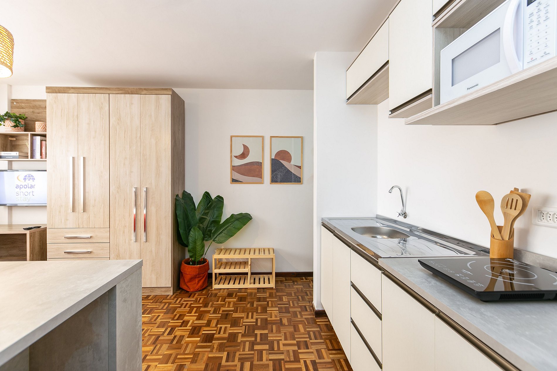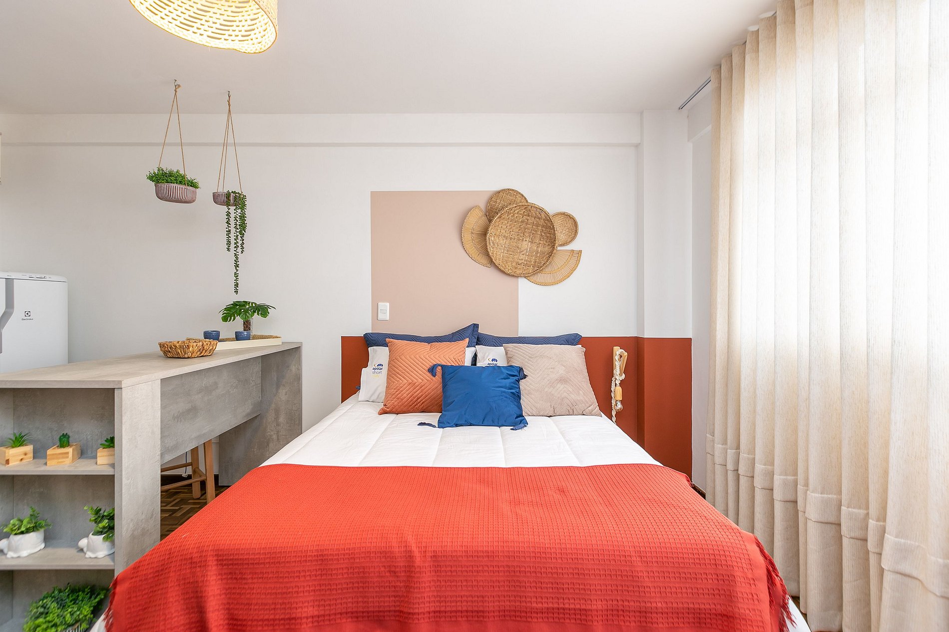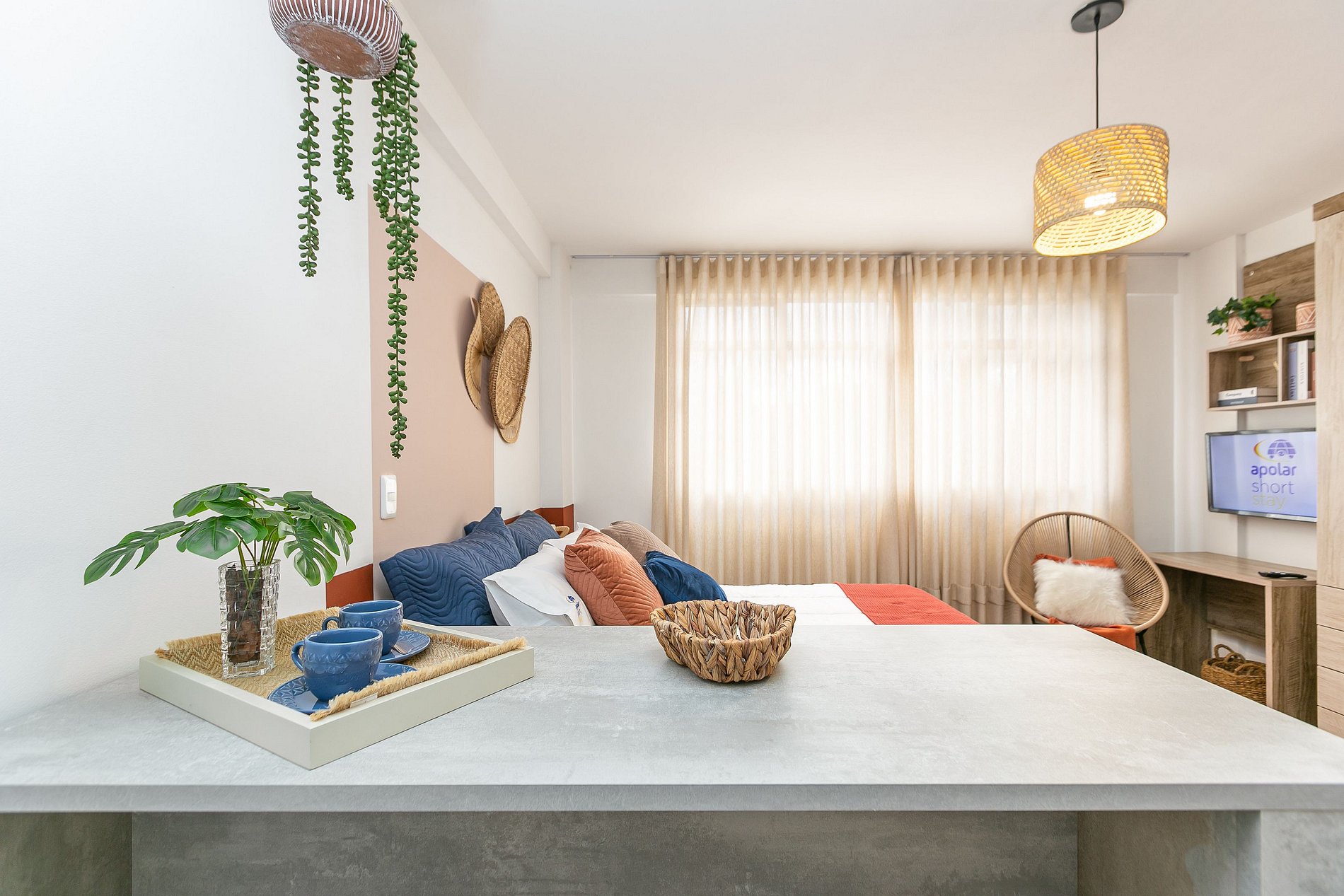 Internet compartilhada, Mobília completa, Cama box casal, Smart TV 32", Banquetas, Geladeira, Fogão por indução, Microondas, Jogo de panelas, Talheres, Jogo de facas, Louças, Utensílios para cozinha.