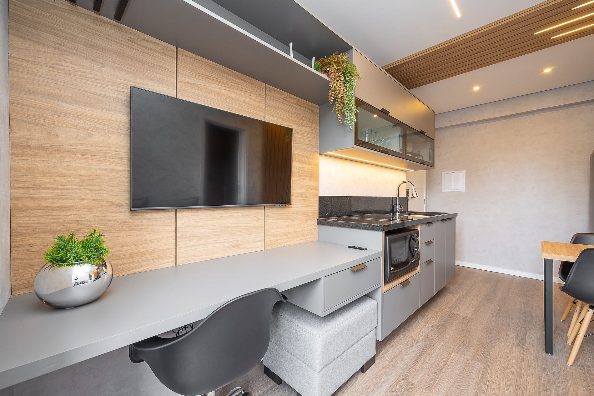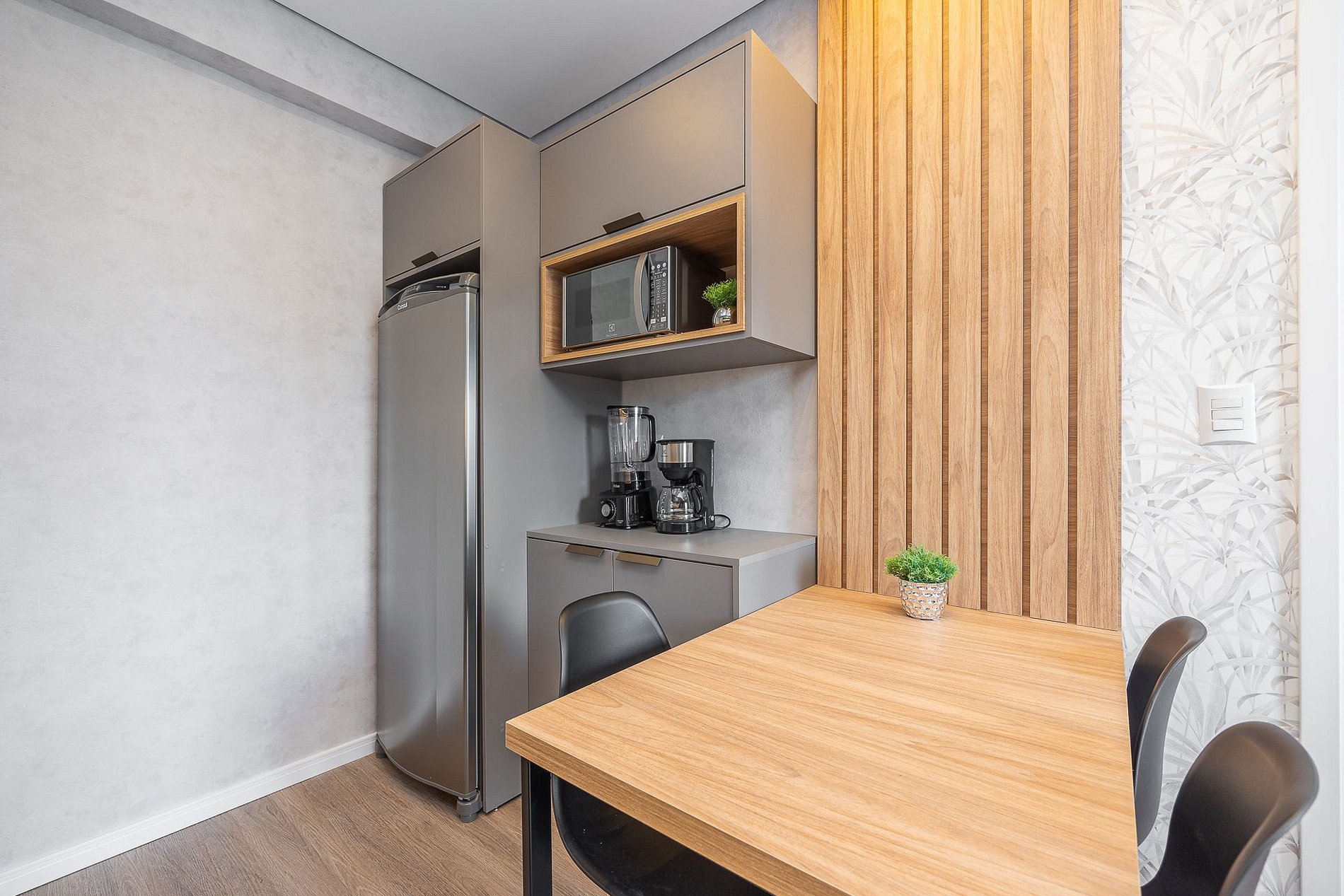 Studio totalmente mobiliado, no 8º andar, em excelente localização no centro de Curitiba/PR. Finamente decorado, com aproximadamente 30m², conta com: