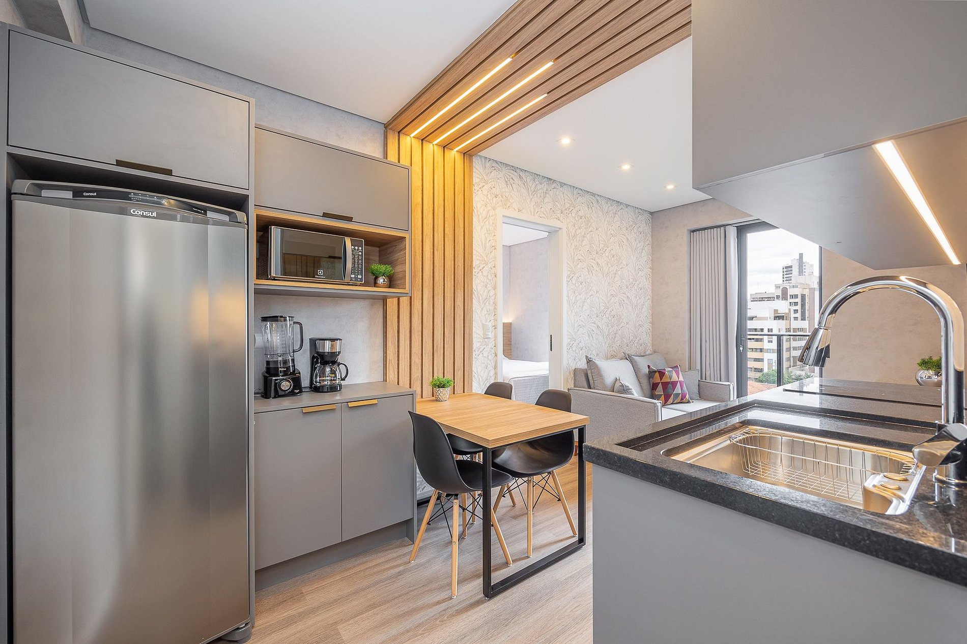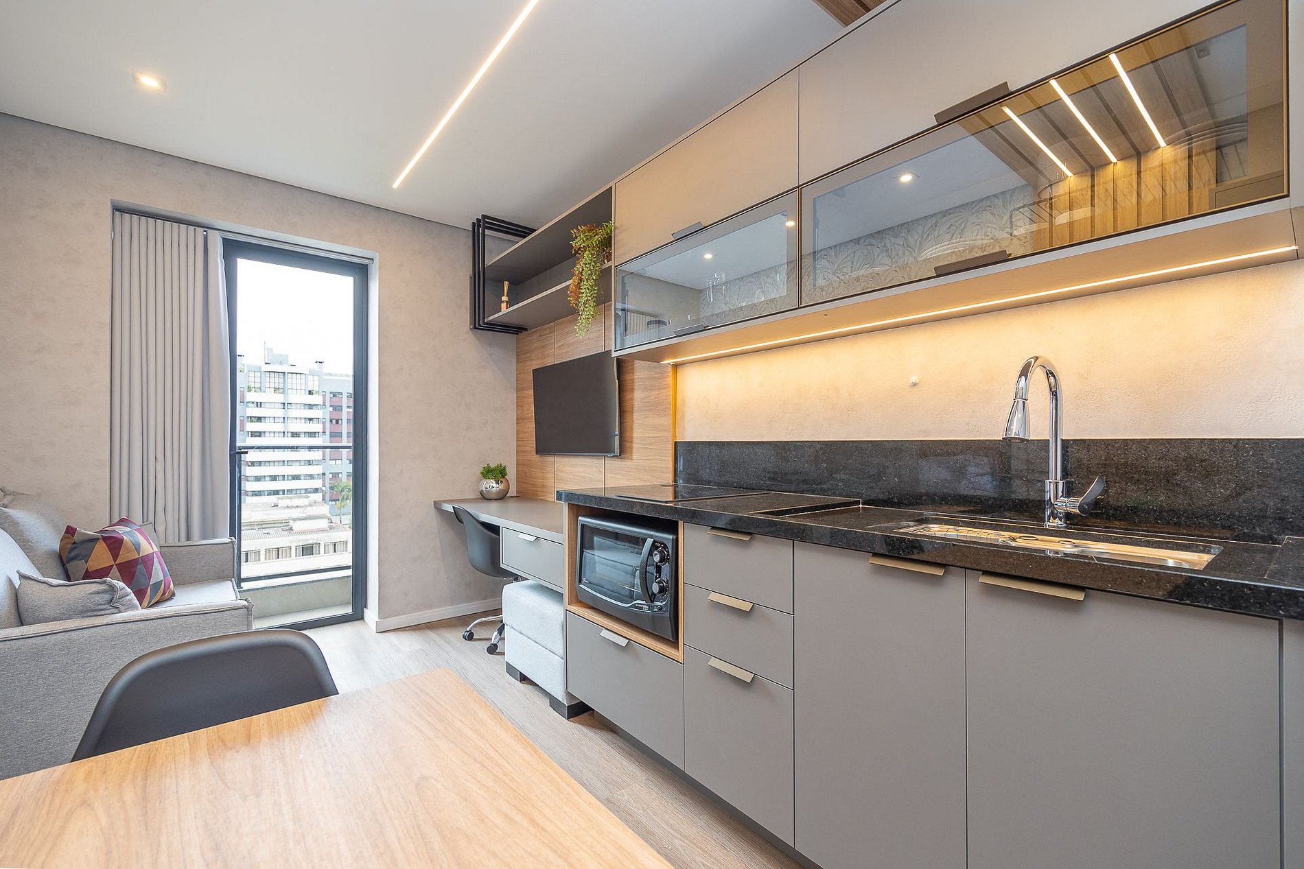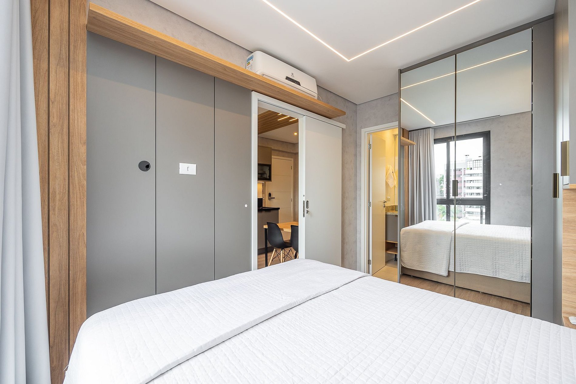 Studio totalmente mobiliado, no 8º andar, em excelente localização no centro de Curitiba/PR. Finamente decorado, com aproximadamente 30m², conta com: