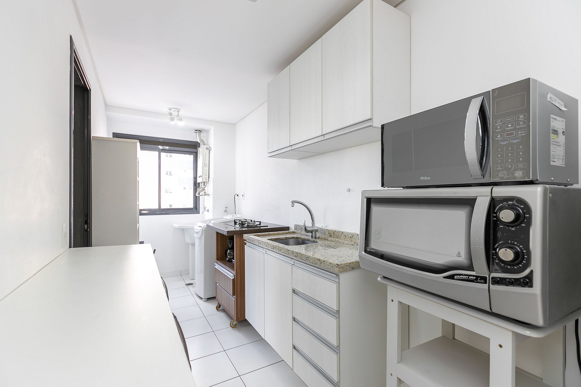 Sacada com churrasqueira, Wi-Fi de alta velocidade, Aquecimento a gás, Amplo espaço para armazenamento.