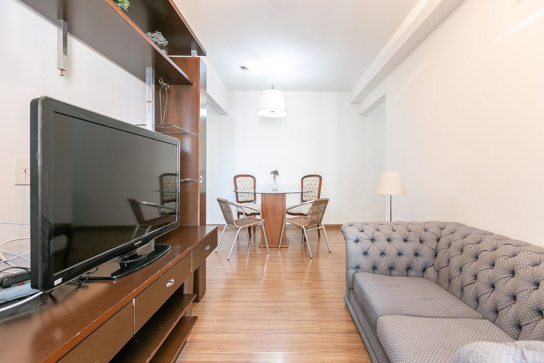 Sala para 2 ambientes com sofá e mesa de jantar