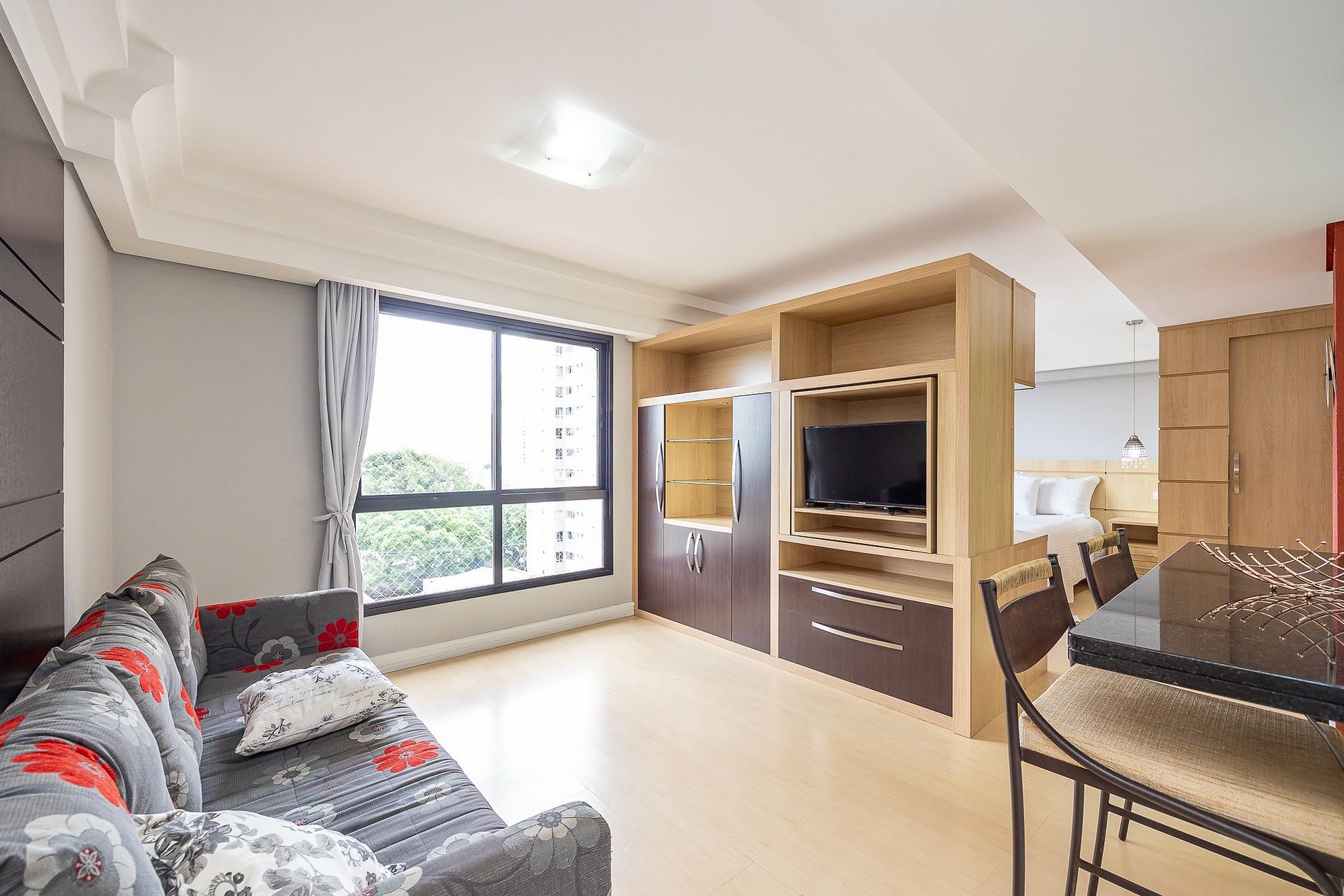 Studio totalmente mobiliado, no 8º andar, em excelente localização no Cristo Rei de Curitiba/PR. Finamente decorado, com aproximadamente 41m², conta com: