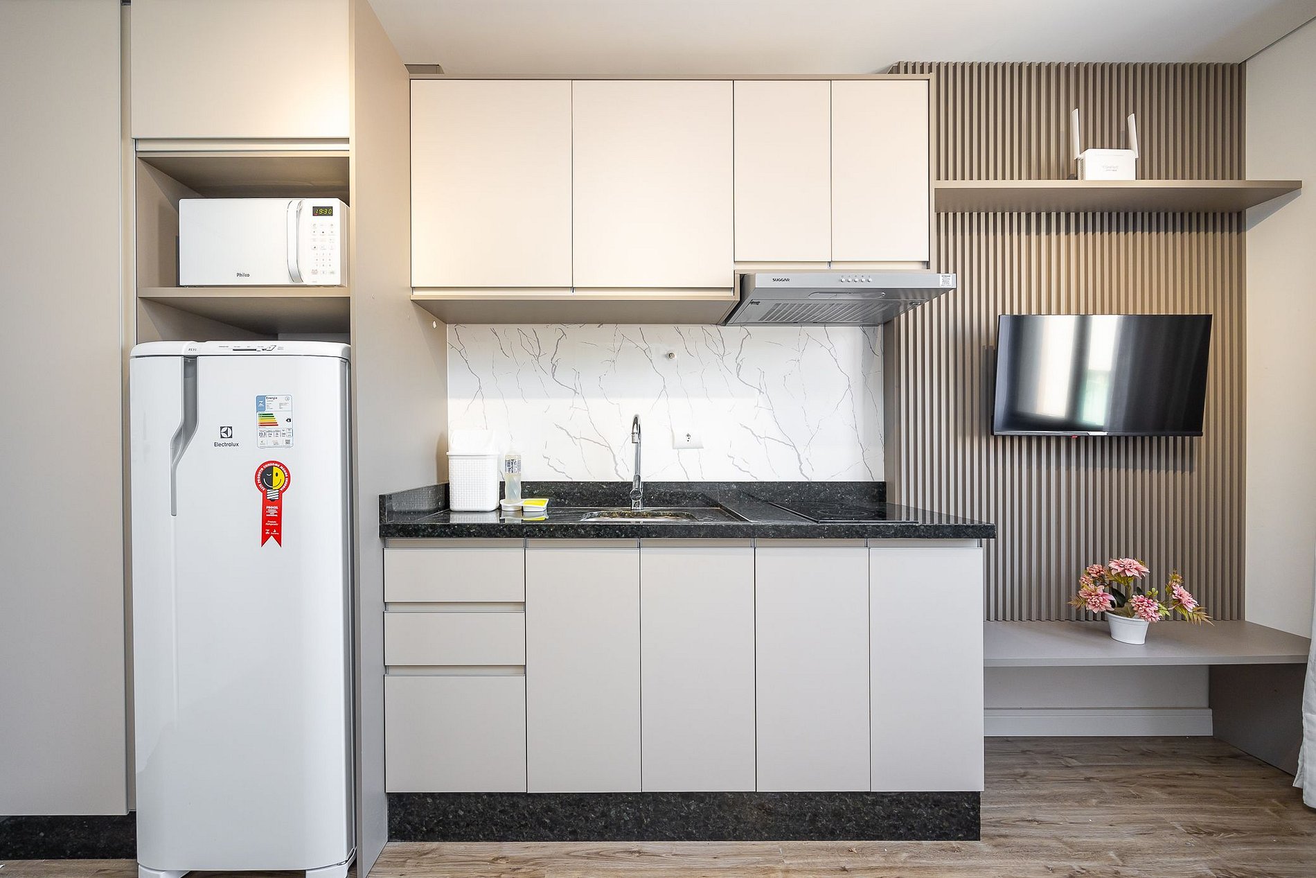 Wi-Fi incluído, Aquecimento central, Móveis sob medida, Cama box casal, Smart TV, Cadeiras, Geladeira, Fogão de indução, ,Jogo de panelas, Talheres, Jogo de facas, Louças, Utensílios para cozinha e ar condicionado.
