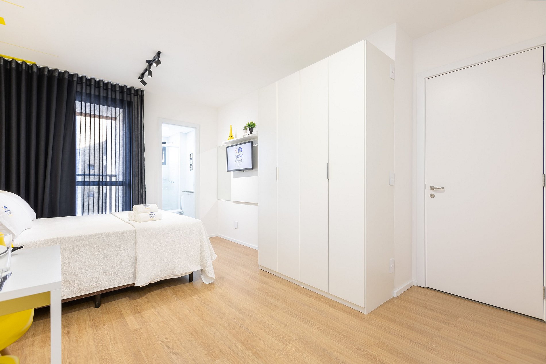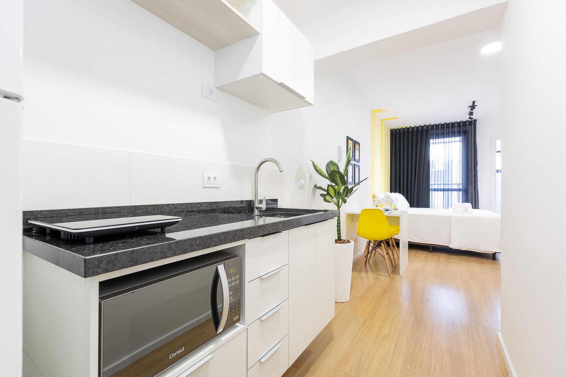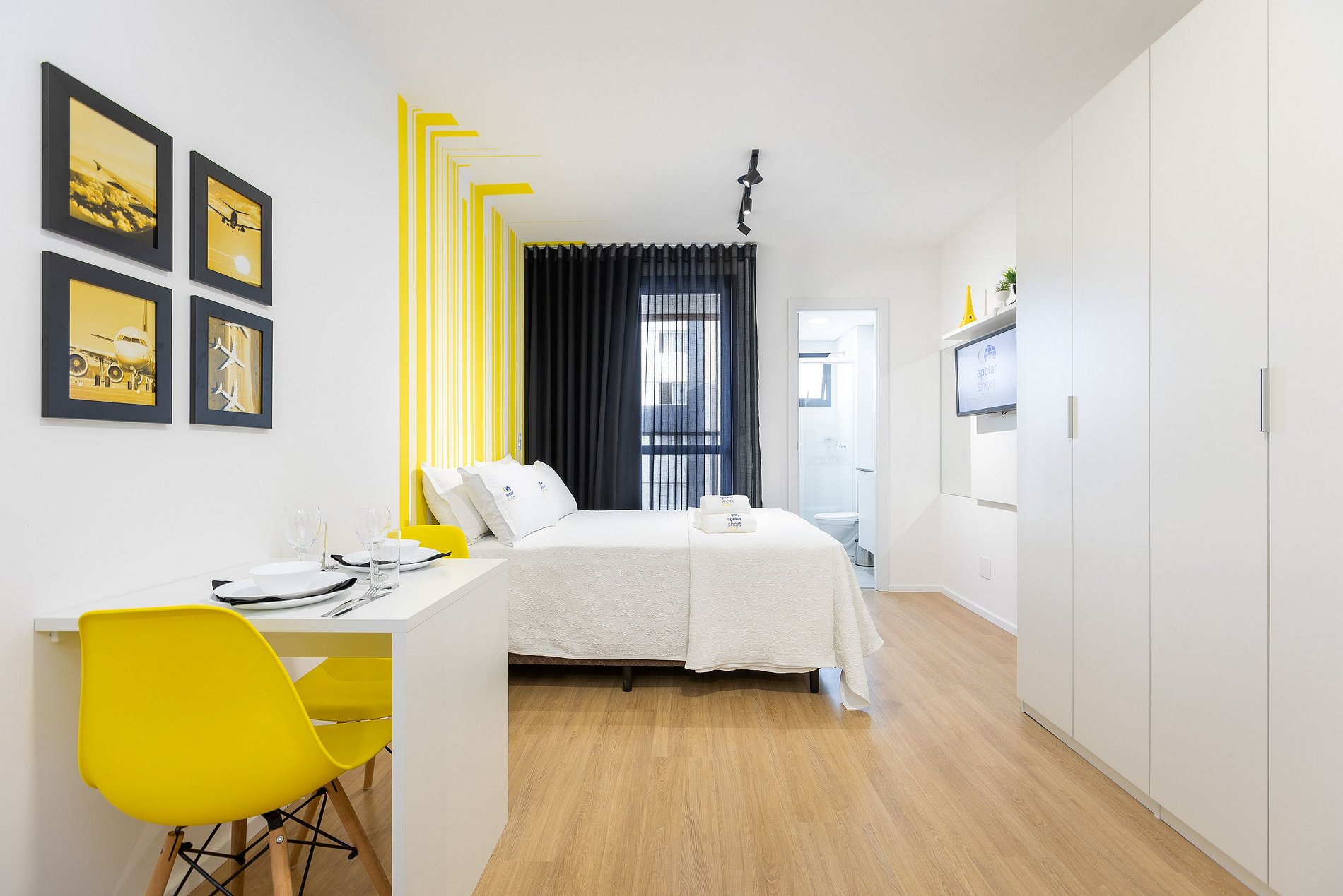Studio totalmente mobiliado, no 10º andar, em excelente localização no centro de Curitiba/PR. Finamente decorado, com tema inspirado no Aeroporto de Curitiba. Com aproximadamente 30m², conta com: Wi-Fi, Aquecimento a gás, Móveis sob medida, Cama box casal, Smart TV 32", Cadeiras, Geladeira duplex, Fogão de indução, Chaleira elétrica, Sanduicheira/Grill, Panela elétrica, Jogo de panelas, Talheres, Jogo de facas, Abridor de vinho, Louças, Utensílios para cozinha, Ar Condicionado.
