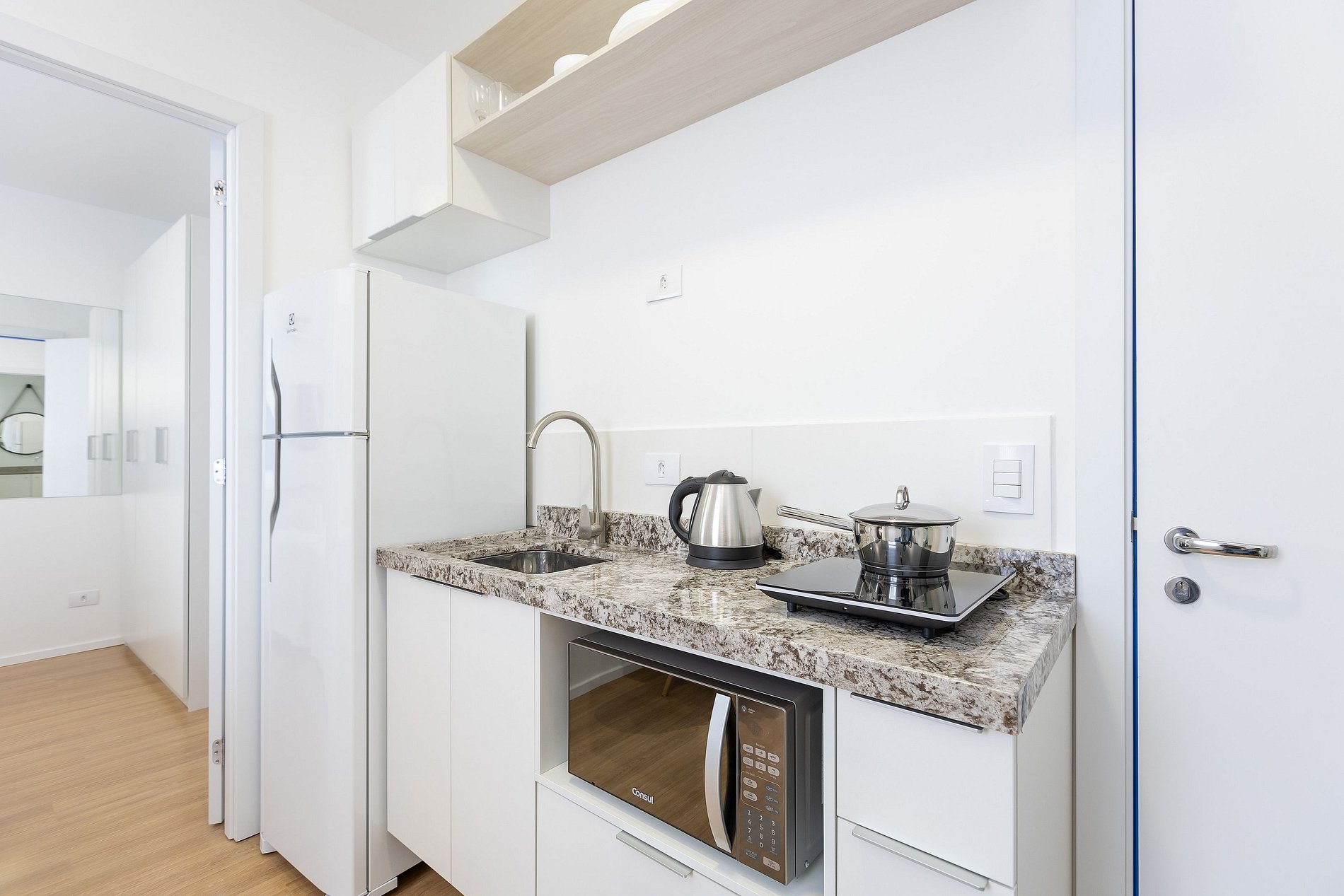 Wi-Fi, Aquecimento central, Móveis sob medida, Cama box casal, Smart TV 32", Cadeiras, Geladeira duplex, Fogão de indução, Chaleira elétrica, Sanduicheira/Grill, Panela elétrica, Jogo de panelas, Talheres, Jogo de facas, Abridor de vinho, Louças, Utensílios para cozinha, Ar Condicionado.