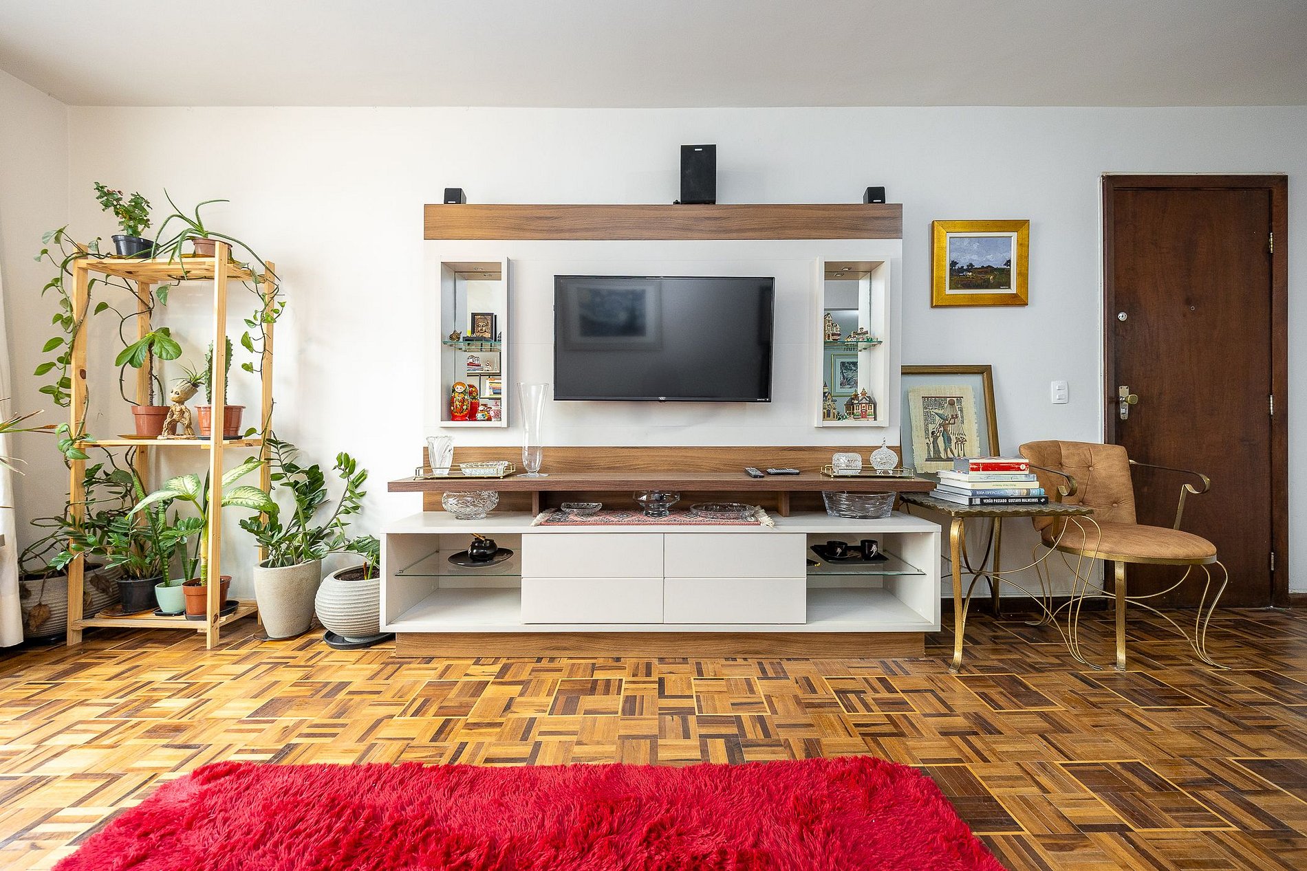 Sala para com sofá, estante, televisão, cadeiras e poltrona.